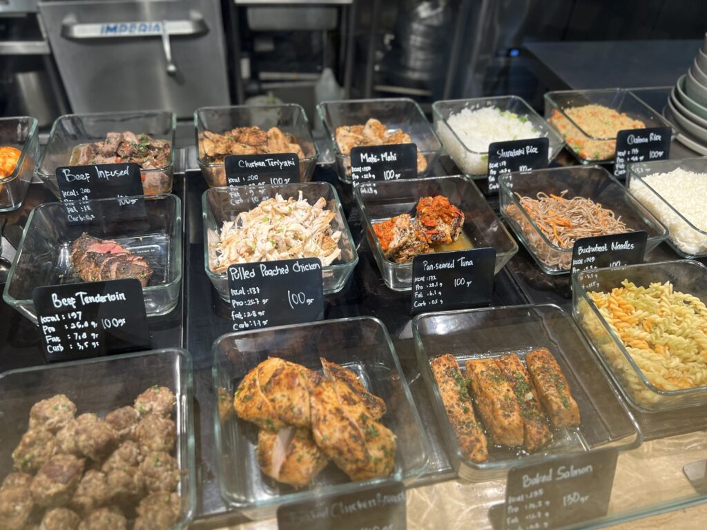 好きな具材を選んでオリジナルのBOWLを作ってみました。鶏むね肉などのプロテイン、野菜、などおいしそうなものがたくさん!