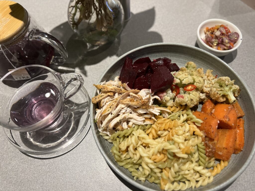 今回は、ビーツ・ハニーキャロット・カリフラワー・鶏肉・パスタ、そしてインドネシアの付け合せ?で大好きなサンバルマターをチョイス。